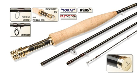 Seria wędek TRAPER GUIDE została zaprojektowana i wykonana z najwyższej jakości japońskiego włókna węglowego o unikalnym splocie firmy Toray Carbon 46T+50T. Charakteryzuje się akcją medium fast, równomiernym ugięciem, niezwykłą elastycznością z jednocześnie zachowaną wysoką dynamiką. Blank jest uzbrojony w amerykańskie przelotki Pacyfic Bay i prowadzącą przelotkę SIC, które gwarantują idealne wyważenie wędki oraz bezoporową pracę sznura. Dolnik wędki wykończony jest portugalskim korkiem klasy AAAA. Niezwykle lekki, a jednocześnie solidny, dobrze trzymający kołowrotek uchwyt wykończony „carbonem” dopełnia całości. Wędka TRAPER GUIDE posiada czterokomorowy pokrowiec z miękkiego materiału, oraz lekką węglową tubę transportową.