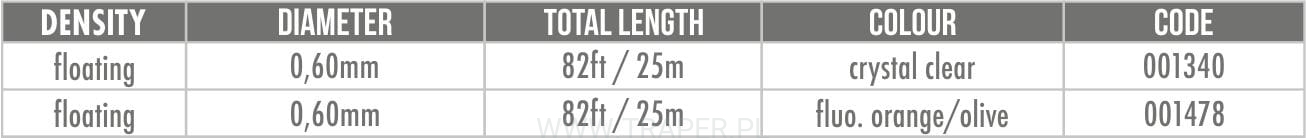 Linka o średnicy 0.6 mm łączy w sobie elastyczność z niewiarygodnie niską rozciągliwością, zapewniając doskonałą wyczuwalność brań. Pomarańczowa końcówka fluo sprawia, że brania są tak samo dobrze widoczne, jak i wyczuwalne. Mikro pętle na obu końcach zapewniają łatwe połączenie z przyponem i podkładem. W 100% zgodny ze standardem FIPS.