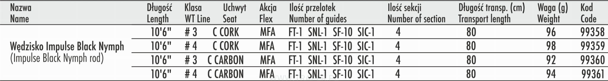 Dla szerokiego grona miłośników łowienia techniką nimfową oferujemy bardzo nowoczesne, perfekcyjnie wykonane wędziska Impulse Black Nymph. Do wyprodukowania wykorzystano japoński, nieszlifowany blank 40+46T. Aby zapobiec klejeniu się żyłki do blanku, oprócz drugiej przelotki typu SNL zastosowano bardzo trwałą, antystatyczną, matową powłokę. Uzbrojenie to niezawodne amerykańskie przelotki Pacyfic Bay. Charakterystycznym elementem wędzisk jest odwrócony uchwyt kołowrotka. Dzięki temu środek ciężkości przesunięty jest maksymalnie do tyłu. Poprawia to balans wędki i szybkość zacięcia. Uchwyt na kołowrotek jest wykonany z najwyższej jakości aluminium w technologii CNC. Osadzony został na lekkiej tulei z włókna węglowego. Dwa warianty dolnika. Pierwszy to rękojeść z portugalskiego korka AAA, wykończonego na końcach korkogumą. W drugim wariancie zastosowano bardzo trwałe, niezniszczalne włókno węglowe. Na zakończeniu dolnika zastosowano piankę EVA. W komplecie cordurowa tuba z przegrodami na elementy wędki. Wędka objęta jest pięcioletnią gwarancją serwisową.